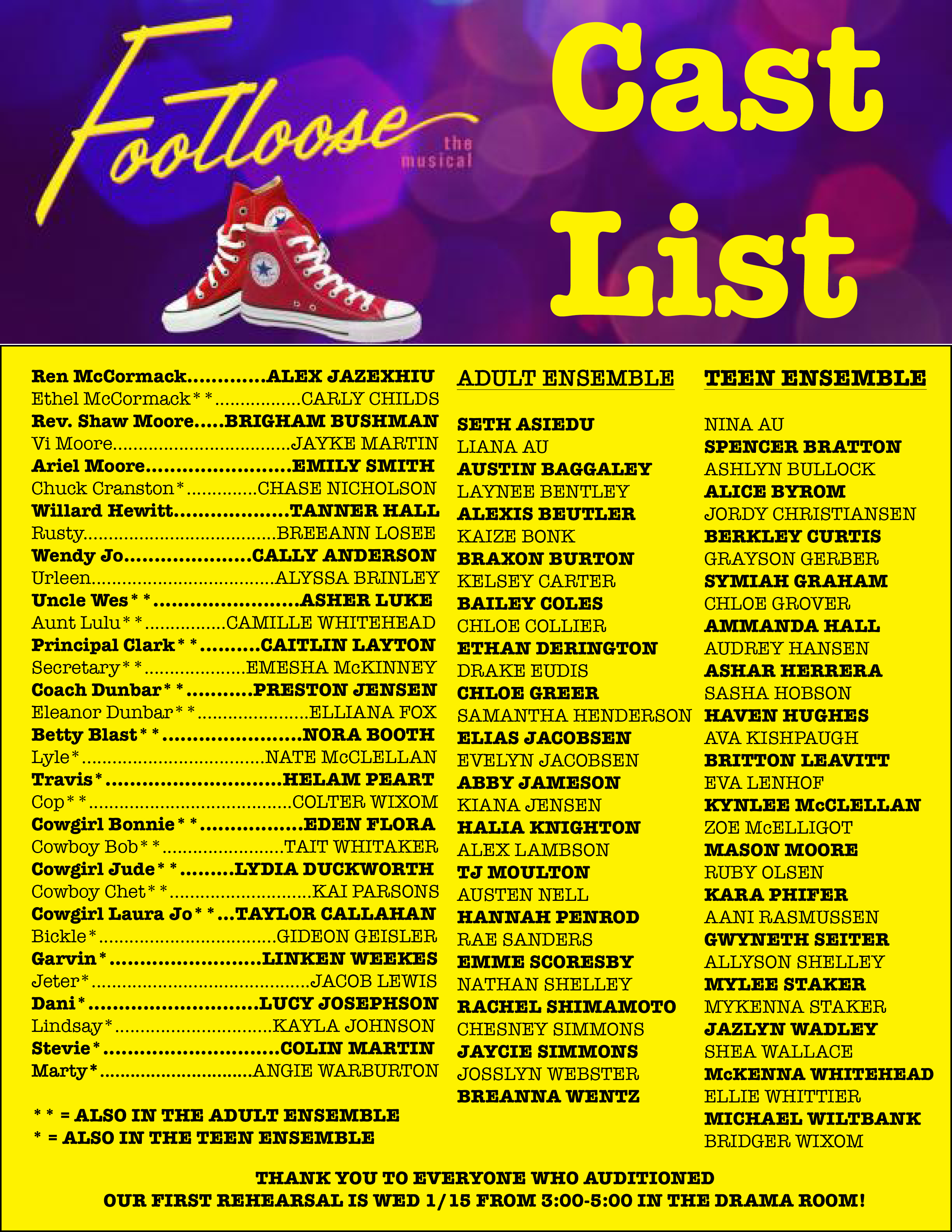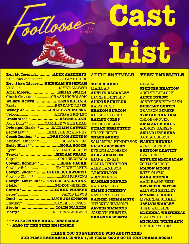 “Footloose” Cast List CONGRATULATIONS to EVERYONE who auditioned! Casting this show was incredibly difficult and we have some amazingly talented and hard-working students at this school. If you have questions regarding auditions or casting, I will discuss those by appointment beginning Jan 22. OUR FIRST REHEARSAL IS WED 1/15 FROM 3:00-5:00 IN THE DRAMA ROOM! Share this: Click to share on X (Opens in new window) X Click to share on Facebook (Opens in new window) Facebook Like Loading... Related Comments are closed.