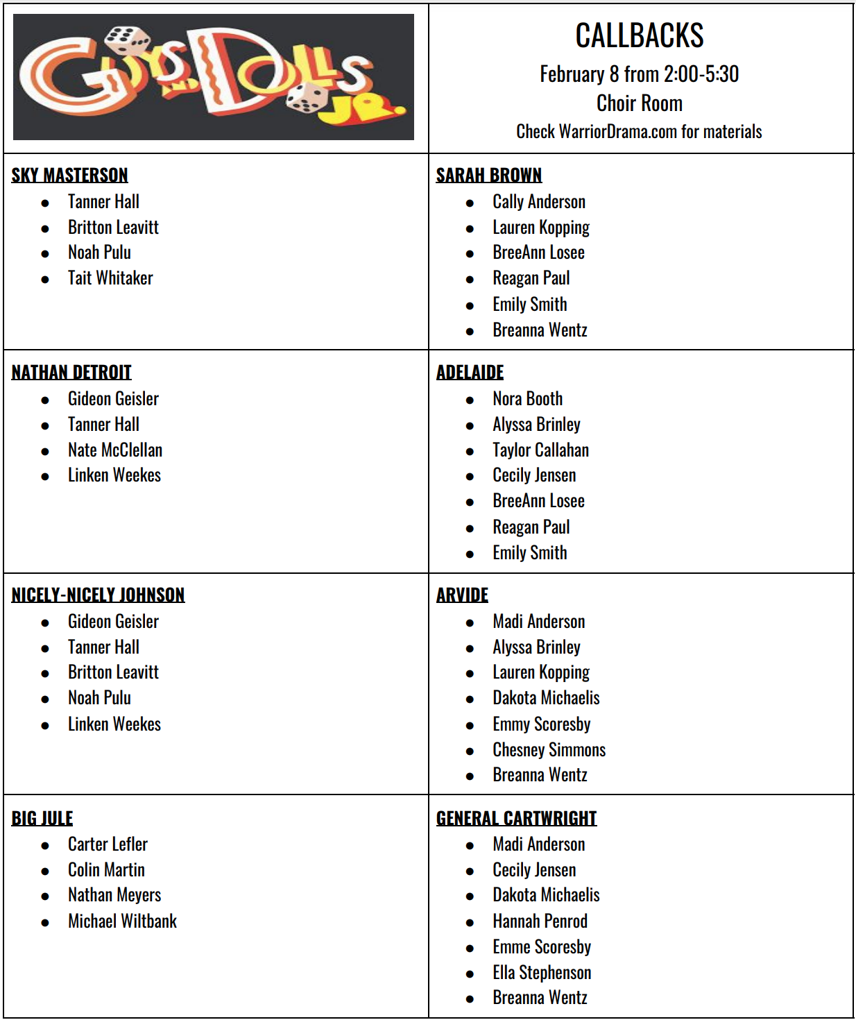 Here is the callback list for “Guys & Dolls”. Please check the list carefully in case you are called back for multiple characters. Callbacks will be Monday February 8 from 2:00-5:30 in the CHOIR ROOM.