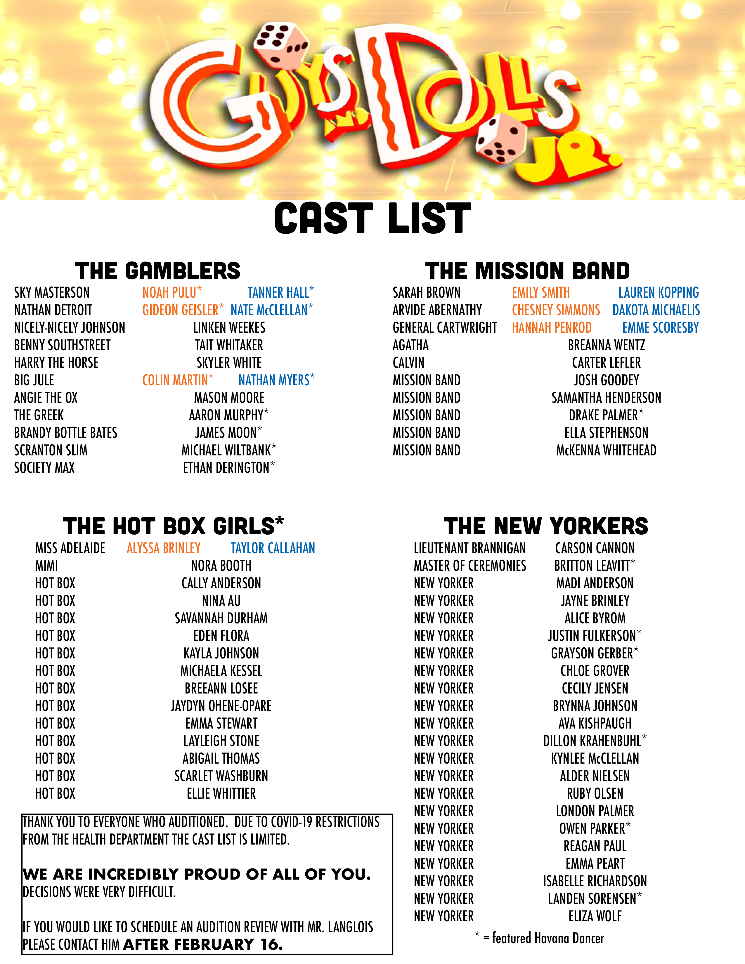Here is the cast list for “Guys and Dolls”. We want to congratulate everyone who auditioned. Casting is so difficult, and due to COVID-19 restrictions from the Health Department our cast size had to be very limited this year.