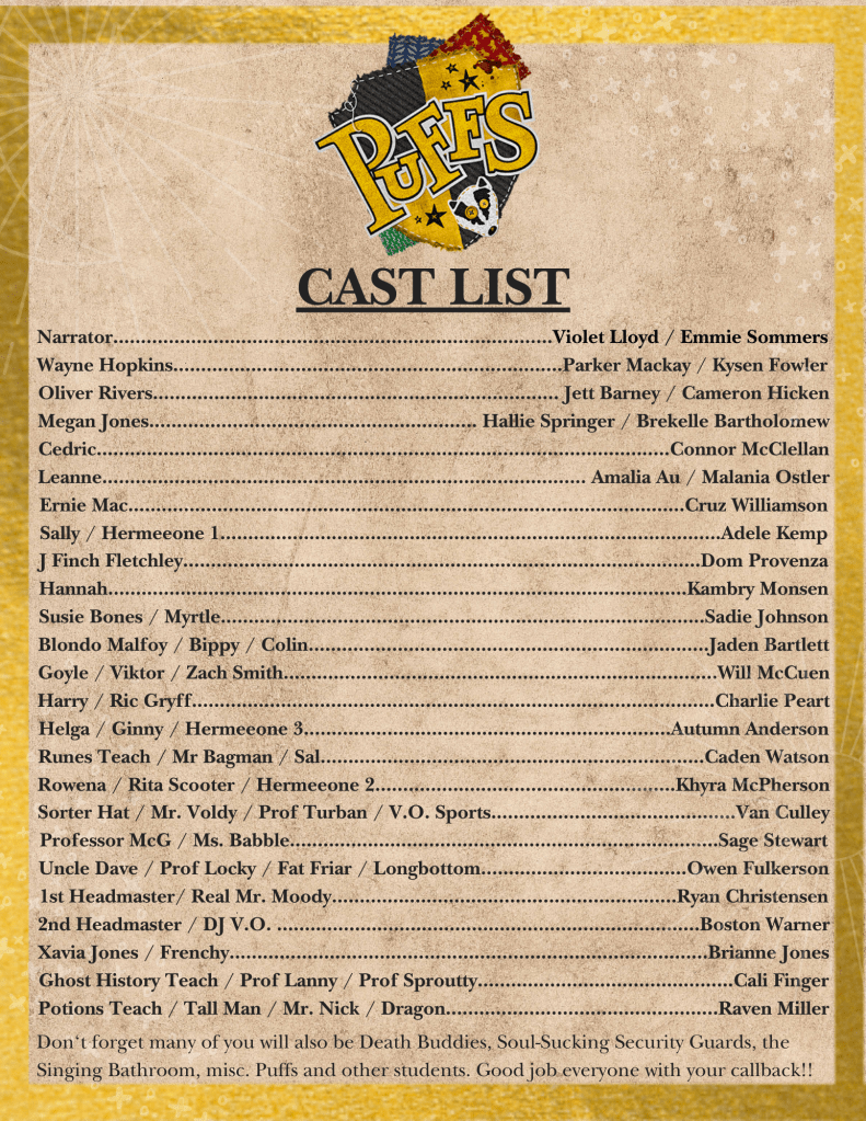 “Puffs” Cast List Share this: Click to share on X (Opens in new window) X Click to share on Facebook (Opens in new window) Facebook Like Loading... Related Comments are closed.