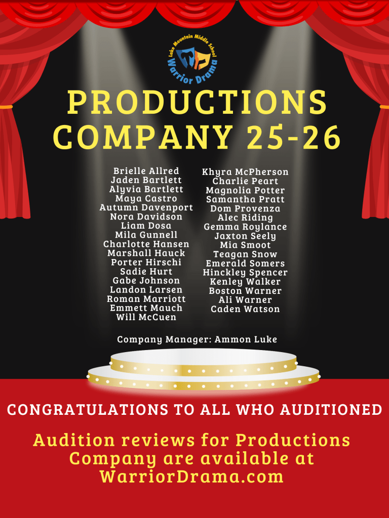 We had SO many more auditions than ever before. Everyone did a good job. If you are not on the class list for next year please make sure you sign-up for Drama 1 and/or Drama 2. If you have already taken Drama 2 you can take it again next year!